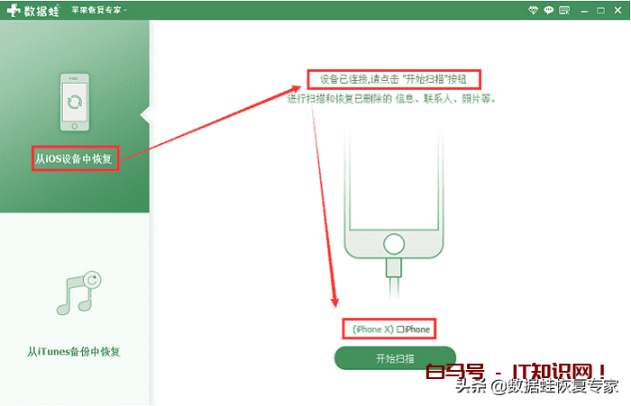 步骤一:使用windows版电脑或者iOS版电脑下载并安装数据蛙苹果恢复专家,使用数据线将手机连接到电脑上,选择“从iOS设备中恢复”,点击“开始扫描”。
