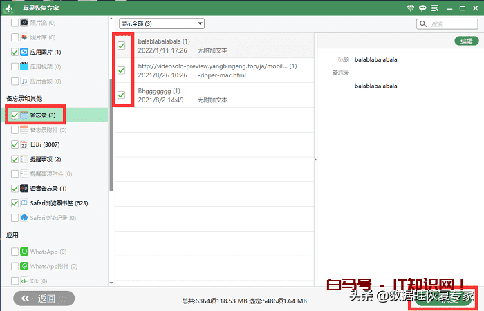 步骤二:扫描结束,下拉左侧目录栏选择“备忘录”,就会看到已删除的和没有删除的所有备忘录,只需要选择需要恢复的备忘录即可,点击“恢复”,误删的备忘录就会恢复到我们的电脑中。