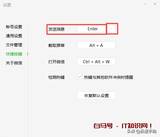 第四步,然后我们将微信的发送消息的快捷按键设置为【Ctrl+Enter】按键。