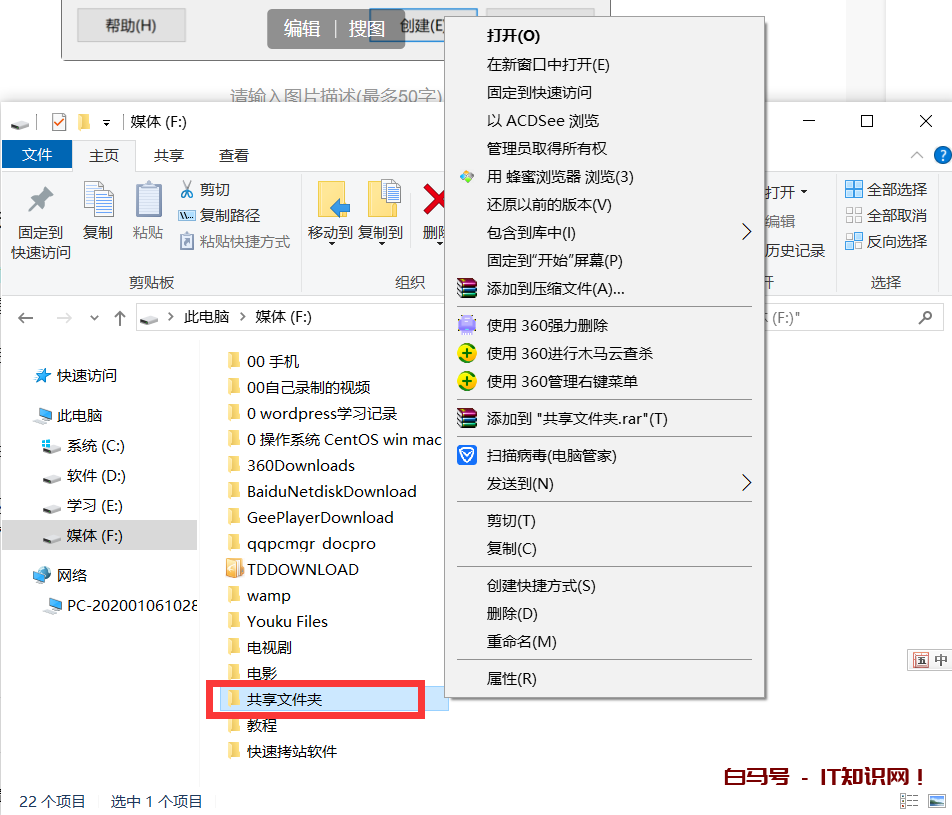 打开“此电脑“,进入某个盘符里(这里以F盘为例),在F盘里创建一个用来共享的文件夹,我这里取名为“共享文件夹”,如下图。
