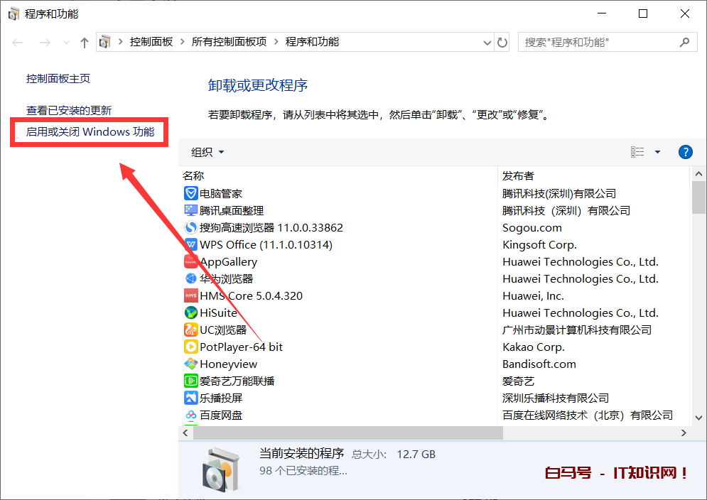 点击左侧的“启用和关闭windows功能”,这时会弹出新窗口(如下图)。