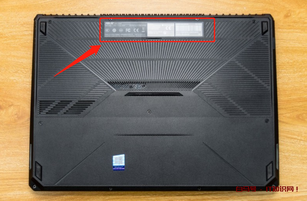 除了上述两种方法之外,如果是查询笔记本电脑或一体机的话,可以通过机身上的“商标”查询,以华硕飞行堡垒6 系列笔记本电脑为例。如下图: