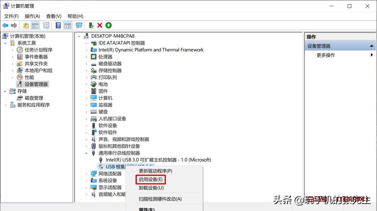 3、如果子项中的设备标识为问号或感叹号,则说明某个设备未安装驱动或驱动存在异常,需要重新安装驱动;如果设备标识为向下的箭头,则说明当前设备处于禁用状态,只需重新“启用设备”,即可解决问题。