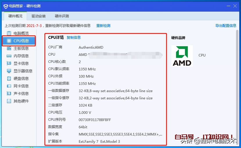 方法三:使用工具软件。上面的方法是查看电脑的基本信息,如果还想查看更详细的内容就要借助其他工具软件了。拿某管家软件来举例,打开软件,在工具箱选项里找到“硬件检测”,打开后就会看到比较详细的电脑配置信息了,一目了然,所有的硬件信息都在同一界面中,标注也很直观,品牌和具体型号大小都很具体。