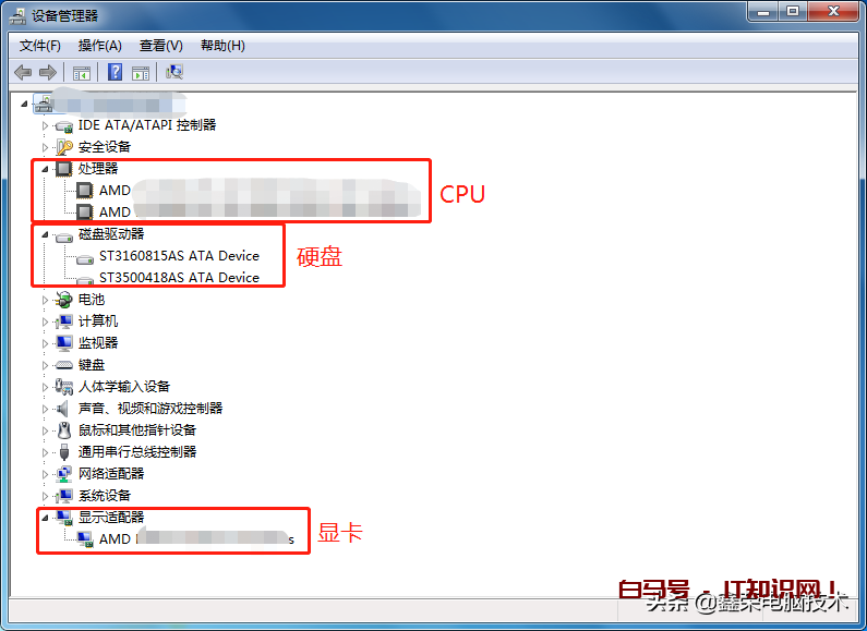 将每一项前方的三角箭头展开,就可以查看详细信息了。处理器是CPU,可以看出是双核还是四核,一般有几行就是几核,图中这个是双核;磁盘驱动器是硬盘,可以看出有几块硬盘,硬盘品牌不同标注方式不同,可以看出硬盘大小,比如160G、500G;最下方的显示适配器是显卡,可以看出芯片品牌和型号。这里还可以查看其他硬件的信息,声卡、网卡、鼠标键盘等等。