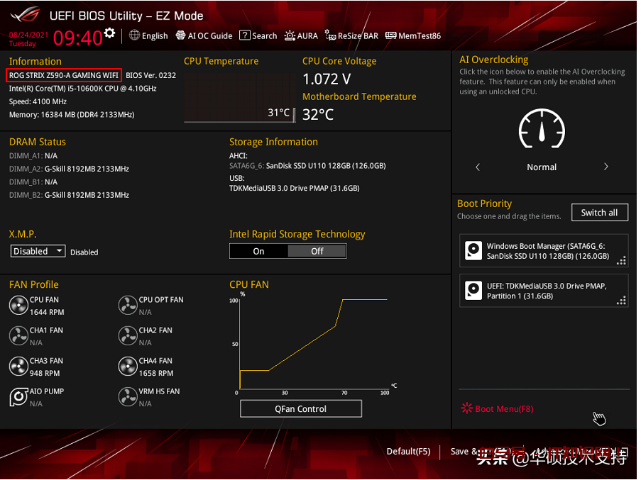 2. 在 UEFI BIOS 中的 EZ 模式下检查您的型号名称。 (下图以ROG STRIX Z590-A GAMING WIFI为例)