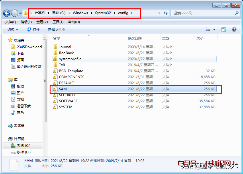 七、删除SAM文档。如果上面的DOS命令不会使用,可以用下面这个方法:同样还是进入winPE系统,找到系统盘C盘,找到以下路径windows\system32\config在这个文件夹中找到SAM文档,删除掉,重启电脑进入系统即可。