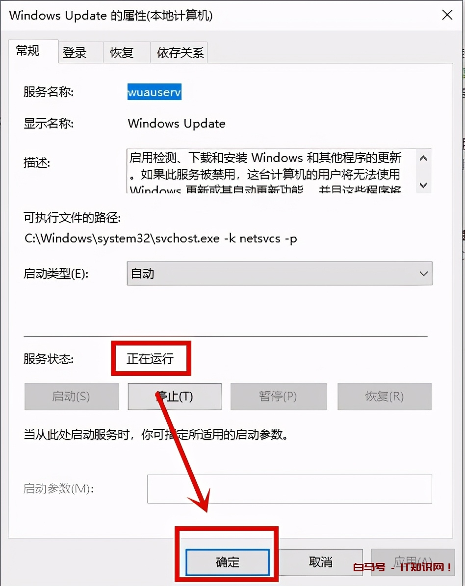 5.然后点击窗口底部的“应用”按钮后,该服务的“启动”按钮由灰色不可点击状态变成可点击状态,点击这个“启动”按钮启动Windows update服务;
