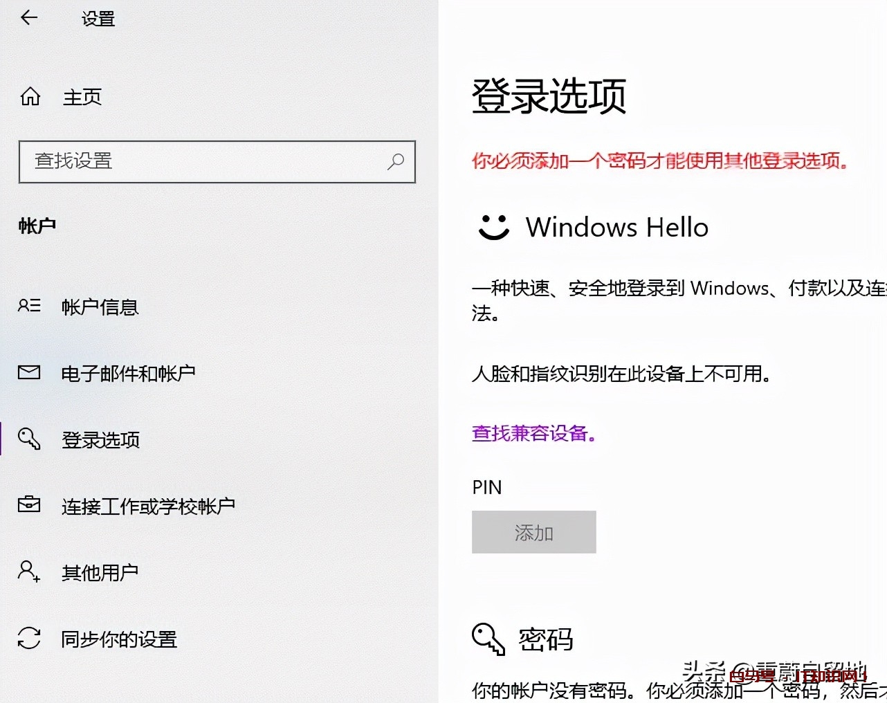 4、进入“登陆选项”选项后在右侧可以看到密码,点击添加密码;