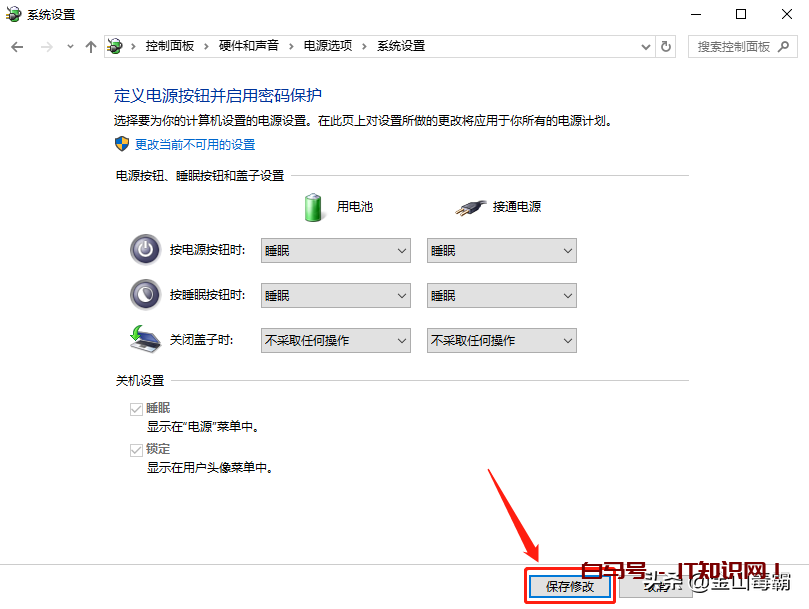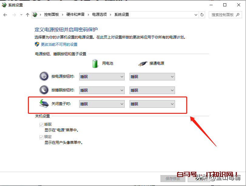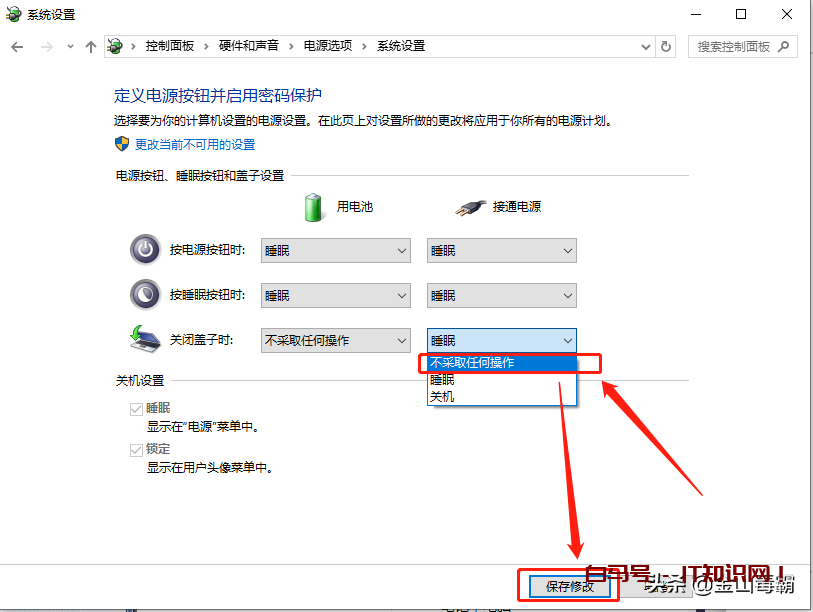 例如在”用电池”情况下,可设置盖上屏幕”不采取任何操作”,即我们在外携带笔记本合上屏幕也不会休眠;
