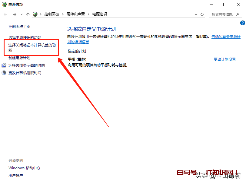 然后在电源选项中选择并进入”选择关闭笔记本计算机盖的功能”设置。