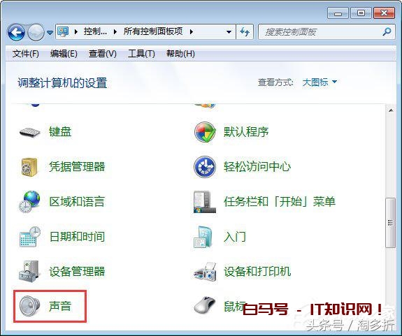 3、选择大图标,在页面中找到并打开“声音”选项。