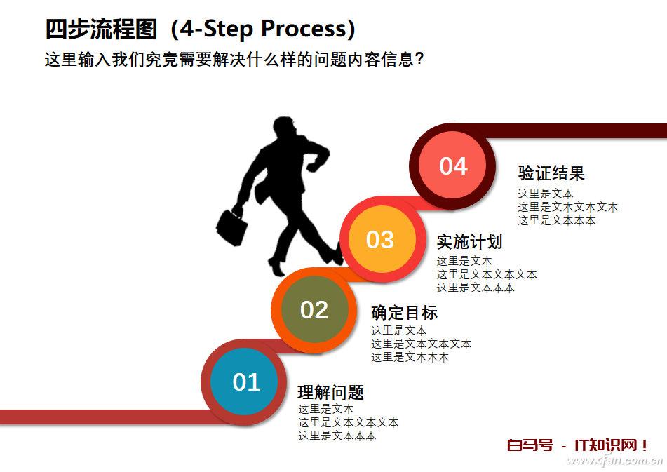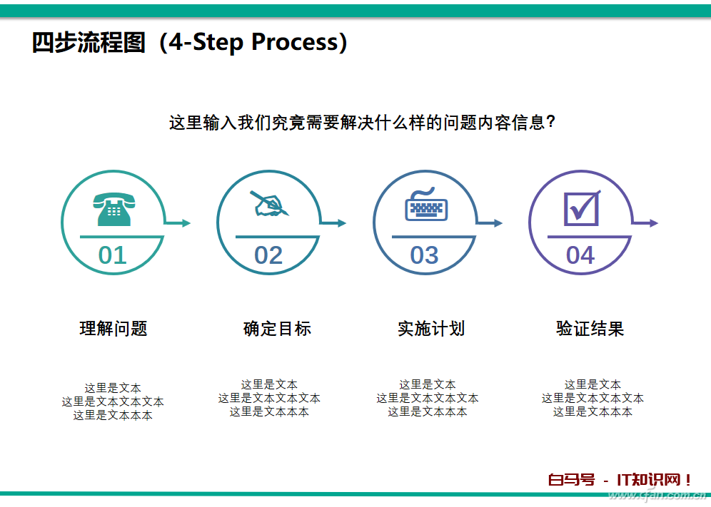 无论生活还是工作中,解决问题总是由小到大、由简单到复杂,往往会分成四步走:首先确定自己当前的位置(理解问题),其次确定最终想要去的地方(确定目标),接着开始具体执行(实施计划),最后完成时检查执行的效果(验证结果)。本文就让我们以图形的方式,在PPT中形象地展示这四步流程(4-Step Process)。