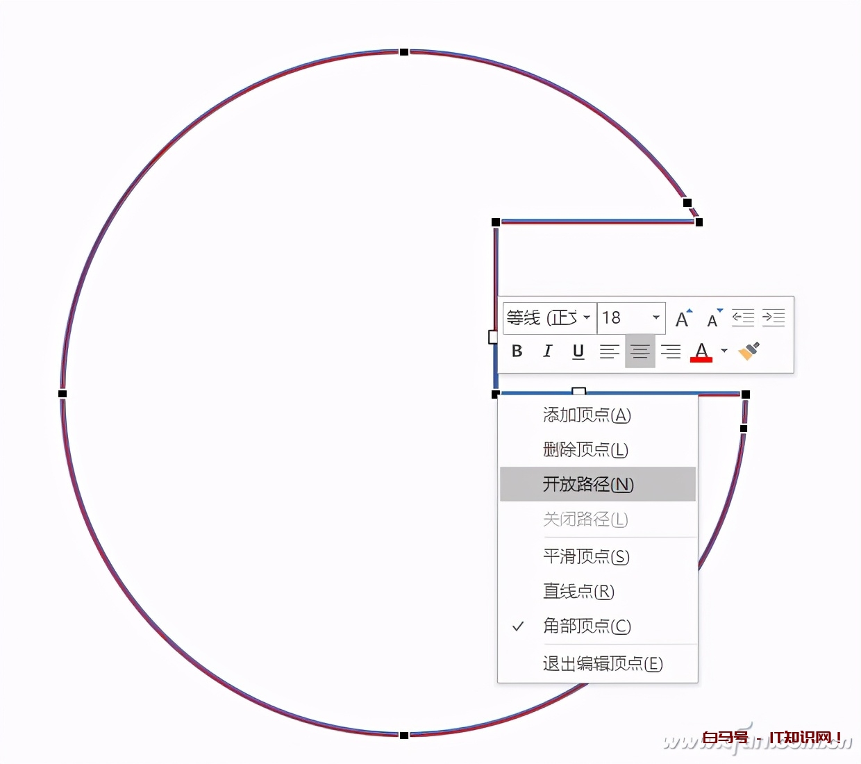右击凹圆形,选择“编辑顶点”,此时图形上将显示多个黑色锚点。右击凹形上的锚点,选择“开放路径”,即可将原本封闭的图形断开(图2)。