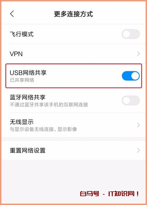 值得注意的是,必须是先将数据线插入到USB接口连接电脑,因为若不连接电脑,上一步操作位置“USB网络共享”呈灰色状态,意味着不可操作。