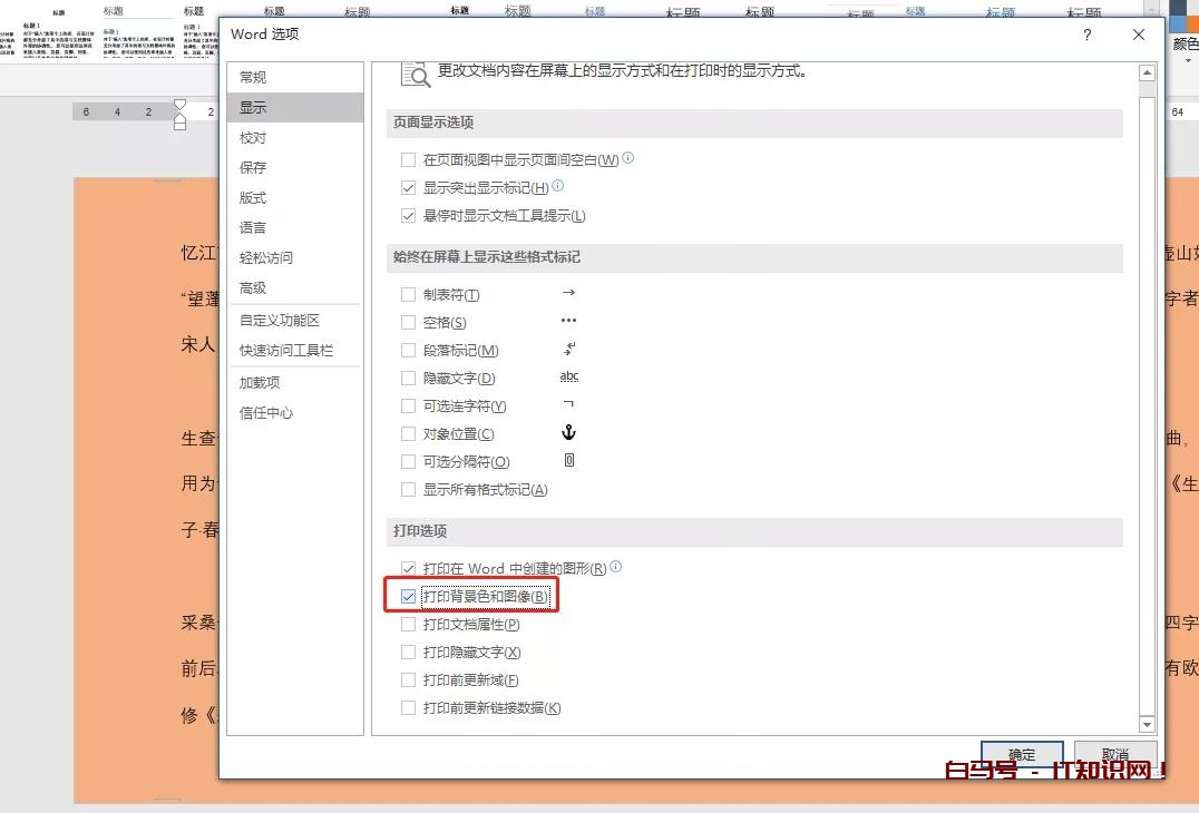 操作方法:选择【文件】–【选项】–【显示】–【打印】,然后勾选【打印背景颜色和图像】就OK了!