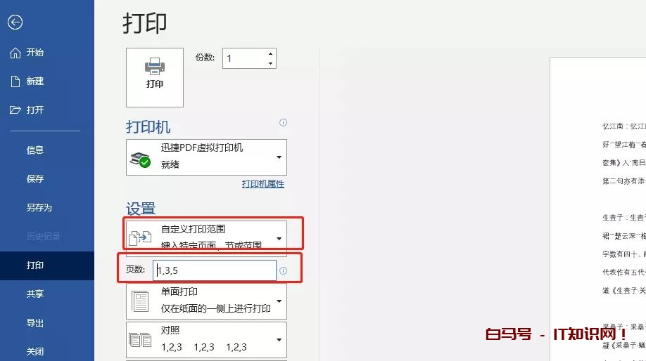 操作方法:依次点击【文件】–【打印】–【设置】–【自定义打印范围】,页数中输入【1,3,5】即可。