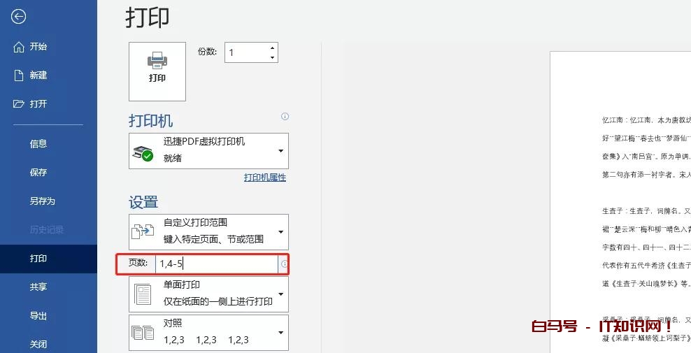 操作方法:依次点击【文件】–【打印】—【设置】–【自定义打印范围】,页数中输入【1,4-5】即可。