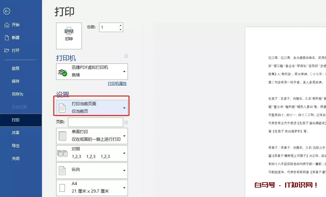 操作方法:依次点击【文件】–【打印】–【设置】–【打印当前页面】即可。