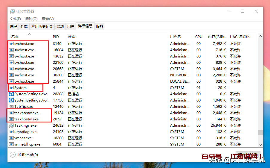 系统进程主要以“System”、“LOCAL SERVICE”、“NETWORK SERVICE”等这类的用户名表示,而自己安装的第三方应用程序,其进程用户名一般为当前登录的用户,比如“Administrator”。