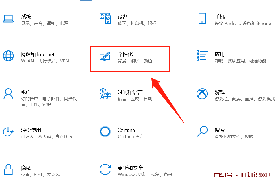 点击“齿轮状”图标可以进入系统的“设置”界面,然后选择“个性化”选项。如下图: