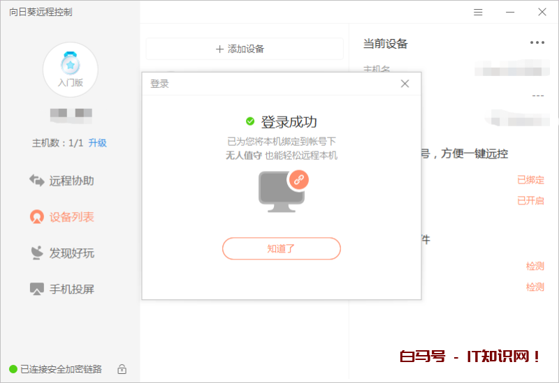 绑定完成后,我们在自己的电脑登录向日葵客户端,选择“我的主机”中对应的主机,在右边进入“桌面控制”进行远控。