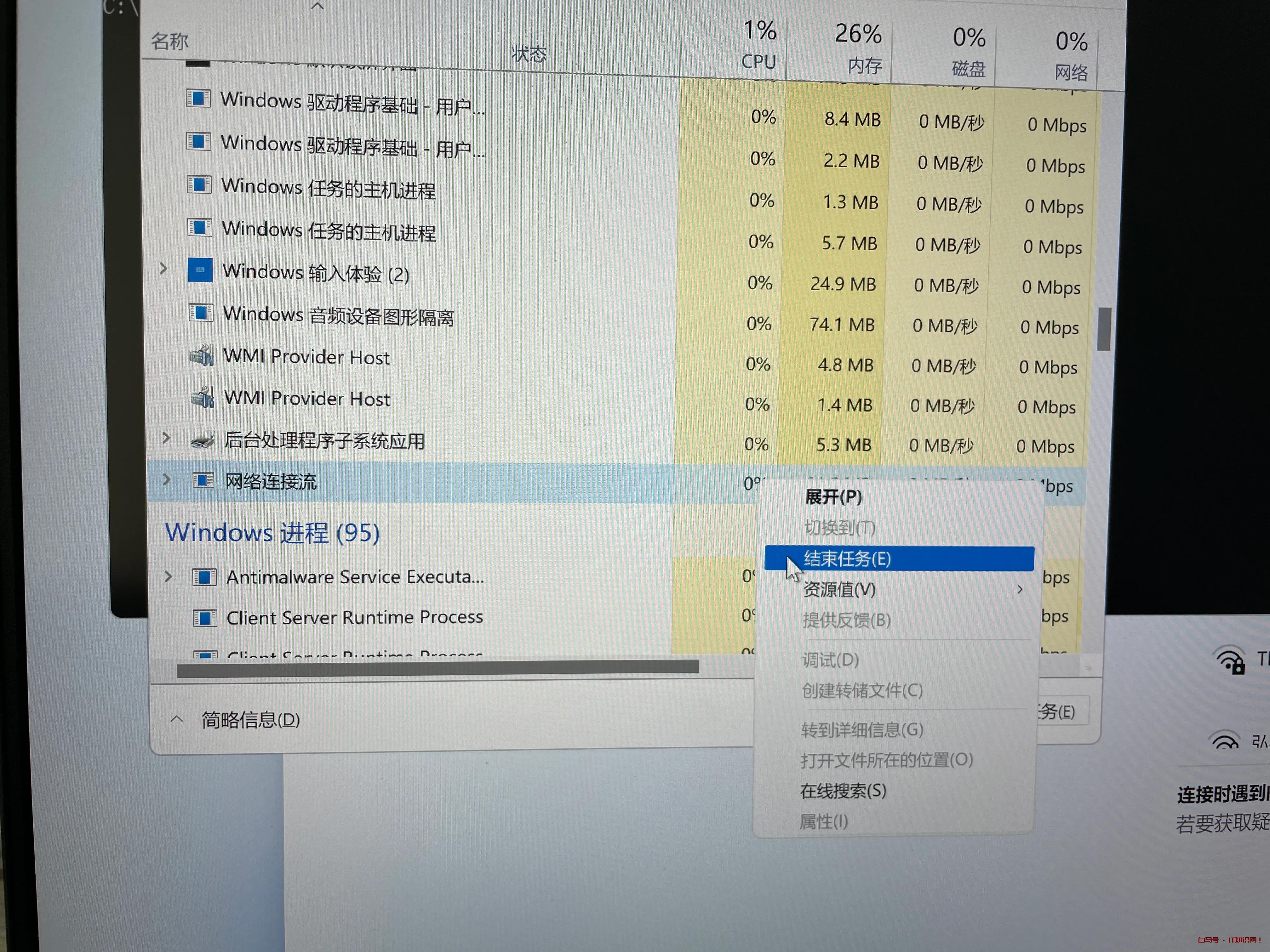 在任务管理器里找到 Network Connection Flow 进程再右键点击 , 选择结束该进程继续回到界面创建本地账户。