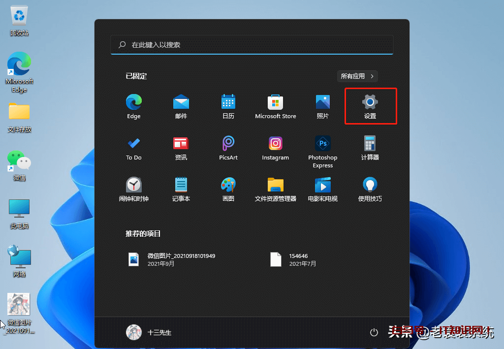 1、首先,按键盘上的 Win 键,或点击任务栏上的开始图标,再点击所有应用下的设置;