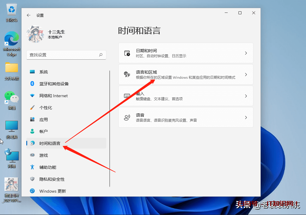 2、系统设置窗口,左侧边栏点击时间和语言,右侧点击时间和语言下的语言和区域(根据你所在的区域设置 Windows 和某些应用的日期和时间格式);