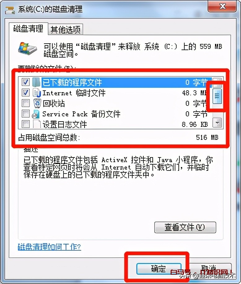 3、计算完成后,会提示你可以释放的空间大小,并且可以自行选择你想删除的文件类型,根据你的需要在选项前打上勾即可,然后点击“确定”;