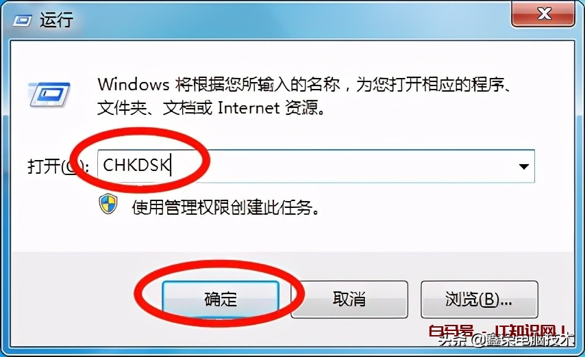 2、在输入框里面输入“CHKDSK”,然后点击确定;
