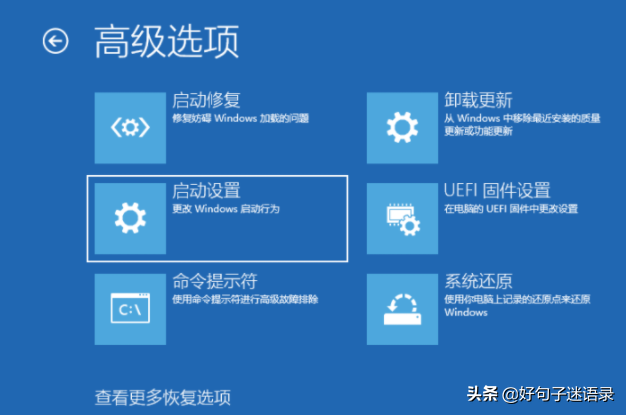 2、如果第一步不行的话,我们还可以参考第一步进安全模式的方法,找到并查看高级修复选项,选择重置此电脑或者还原系统的方法修复。(还原系统的方法适合之前有备份系统的情况)