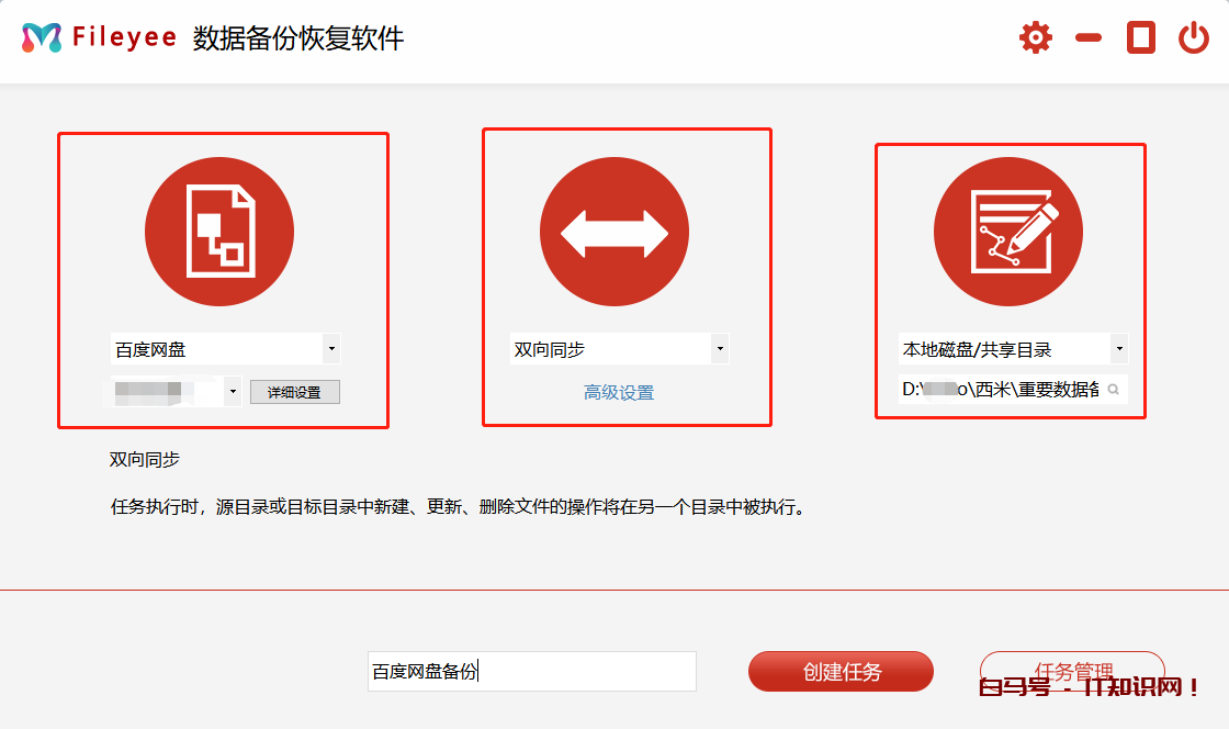 软件安装完成之后,打开软件,目标路径选择百度网盘,点击“详细设置”会弹出百度网盘设置。可以先不动,先选择文件同步方式,这里简单大家选择双向同步,这样无论哪个文件夹文件有变化,目标文件和源文件都会同步更新,在选择本地磁盘,就是你电脑上想要保存网盘数据的那个文件夹。