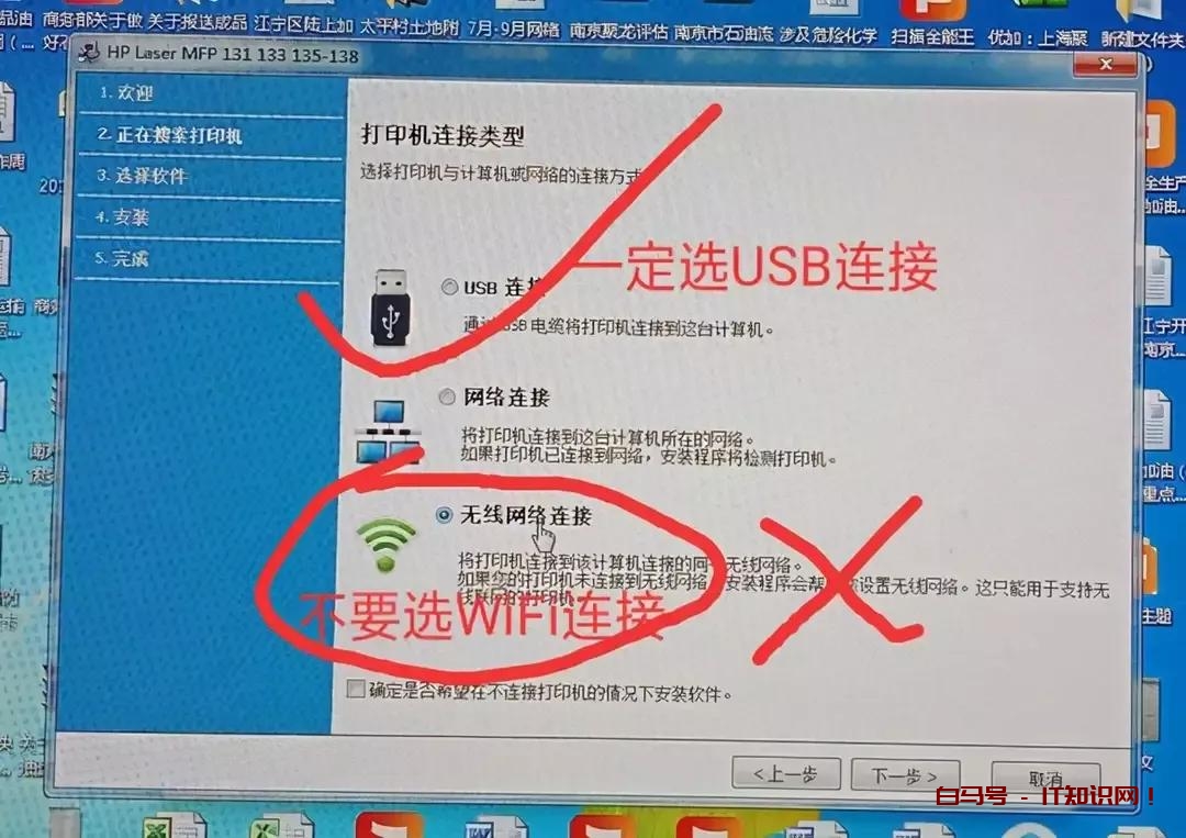 3.按提示,一定要选USB 连接打印机。这一步,千万不要选WiFi 无线连接打印机。