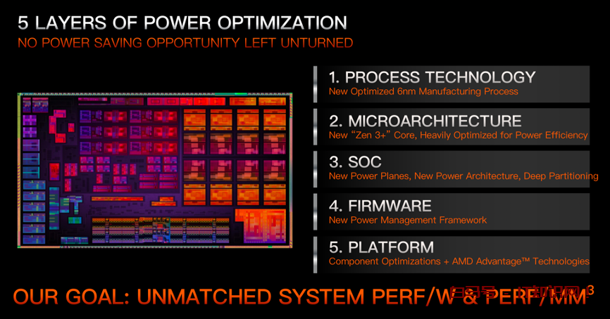 AMD这次为玩家带来了10款全新的6000系“Zen 3+”移动处理器,其中有6款是针对轻薄本和轻薄性能本打造的。而其中像是锐龙5 6600H到锐龙9 6980HX则是专为发烧级性能本所打造的,其最高45W+的功耗表现,也让AMD 6000系列移动处理器在每瓦功耗方面有了更强的性能表现。它可以在一个比较轻薄的外形,在低功耗水平上去释放很强大的一个性能,AMD能够在35瓦的水平上去完成接近对方110瓦的这种工作负载。这意味着什么?我认为最主要就是在性能提升之外,我们可以有机会选择更轻薄的笔电产品,而且在性能释放之外也不会被散热的噪音影响体验,更主要的是在续航方面,它也让你的轻薄本可以在外面使用更久。