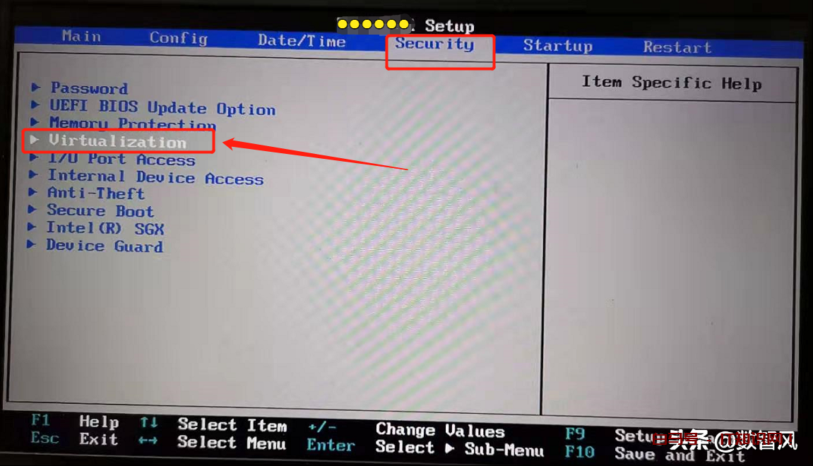 ②、切换到security选项卡,按向下键移动光标到“virtualization”选项,点击进入。