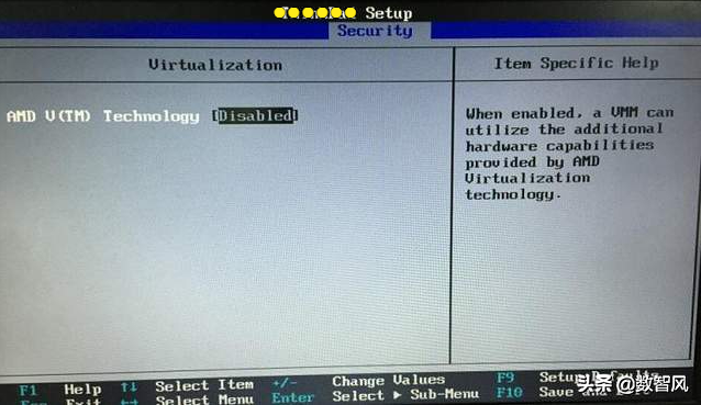 ①、如果电脑装的是AMD的CPU,同样是按F1进入BIOS界面,并依次选择“security>virtualizaion”选项进入。