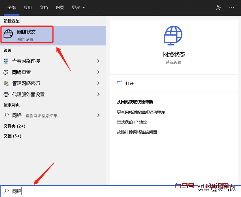 ①、点击win任务栏中的搜索图标,然后在搜索框中输入“网络”。系统会自动匹配“网络状态”应用,敲回车启动应用。