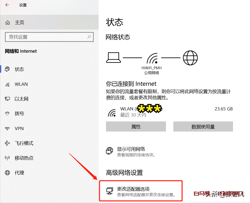 ②、在网络状态页面,点击高级网络设置中的“更改适配器选项”菜单进入。