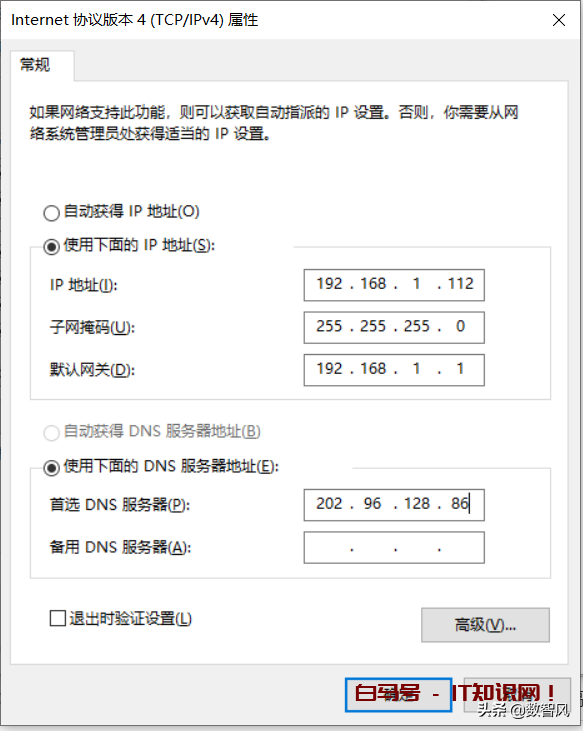 ⑤、在IP配置页面中,可以看到当前网卡的配置。如果要连接的网络是需要手动配置IP地址的,则对比一下同网段正常电脑的IP配置。如果两者的掩码、网关、DNS信息都一致,且IP地址最后一位不同。则表明配置正确。如果不是,则需要修改到正确状态即可。注意不能出现IP冲突,即1个ip不能同时被两台电脑使用。