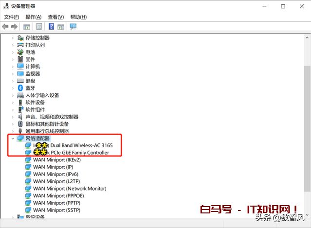 ②、在设备管理器设置页面中,找到网络适配器选项,点击展开可以看到电脑上的安装的网卡。