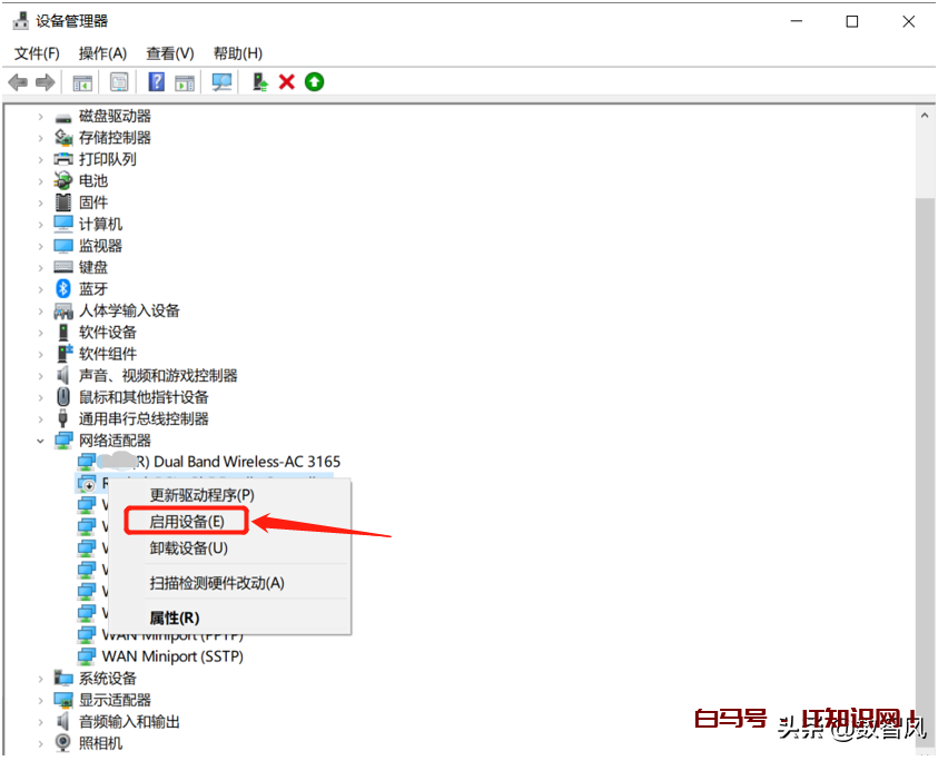 ④、右键点击刚刚禁用的网卡,在弹出的菜单中,点击“启用设备”菜单,即完成了网卡的重启。