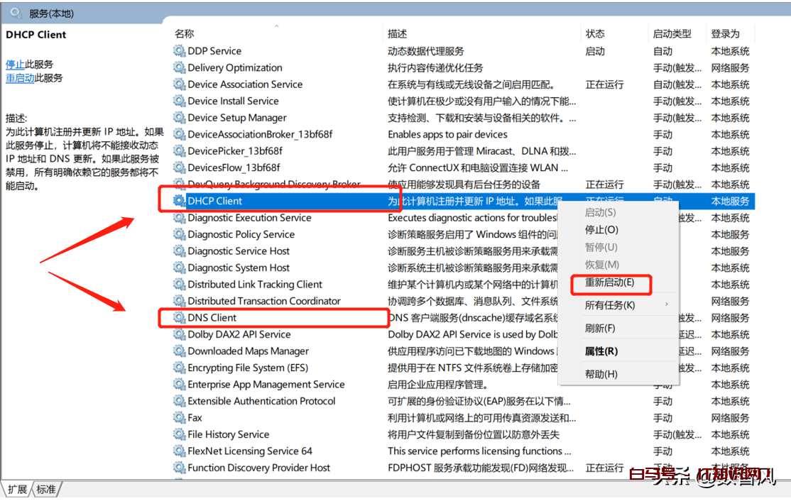 ②、在服务设置页面,找到“DHCP Client”和“DNS Client”两个服务。分别在右键菜单中点击“重新启动”即可。