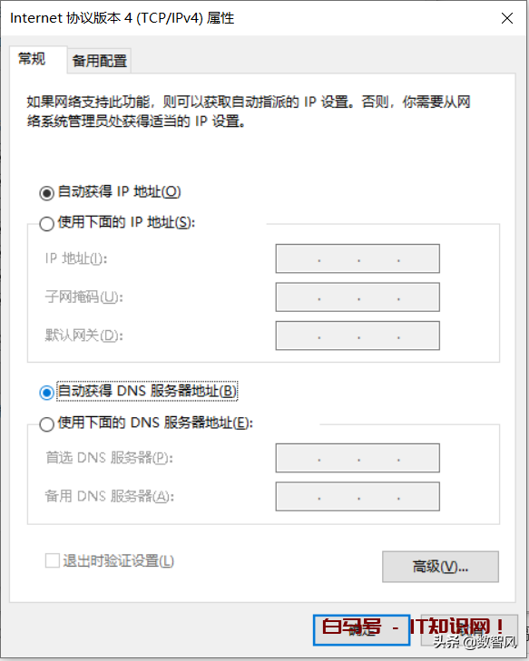 ⑥、如果要连接的网络是使用DHCP自动分配地址的,则勾选“自动获得IP地址”和“自动获得DNS服务器地址”即可。