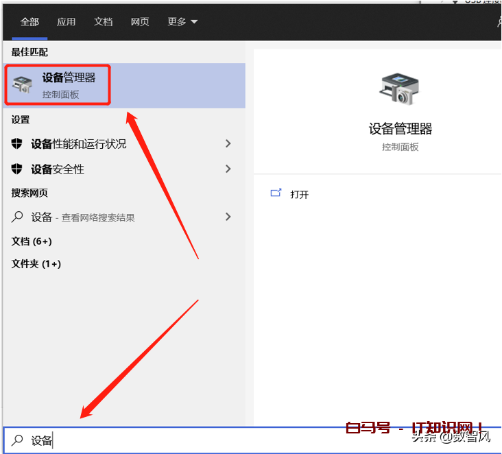 ①、点击win任务栏中的搜索图标,然后输入“设备”。系统会自动匹配“设备管理器”应用,敲回车启动应用。