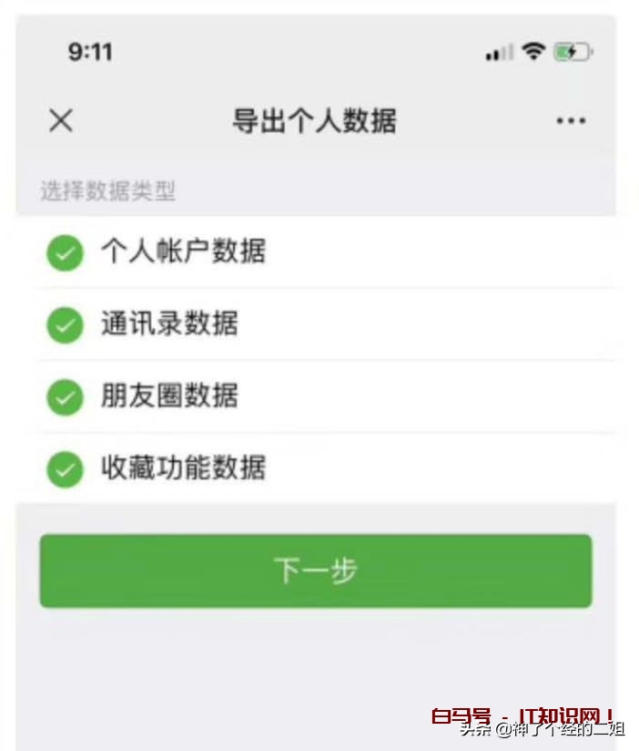 根据页面提示,在指定区域点击,可以开始导出账号数据。目前支持导出个人帐户数据、通讯录数据、朋友圈数据、收藏功能数据等数据。