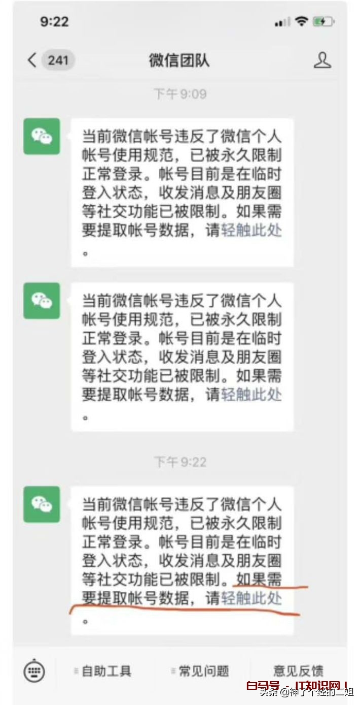 微信最近出了个新功能——被封的账号可以“临时登陆“,进入“微信团队“界面。临时登陆状态下,账号不能正常收发消息、朋友圈等功能。但是可以导出微信号的所有数据。