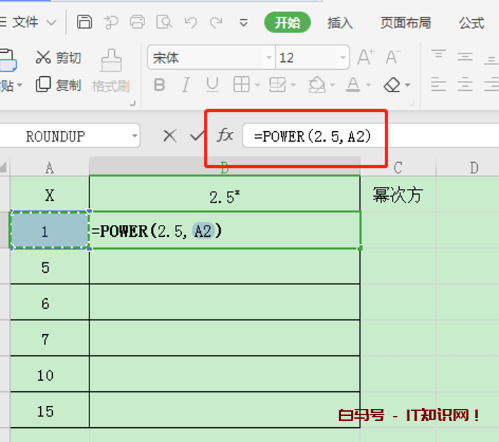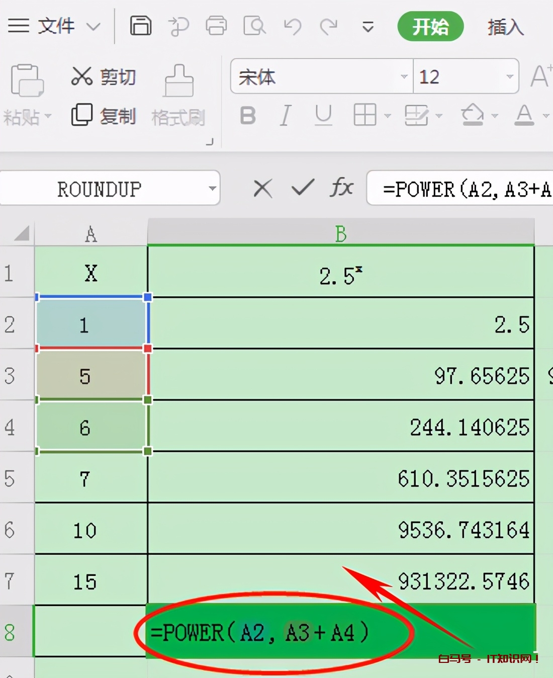 例如,我们要求下表中2.5的X次方,就在表格中输入公式: