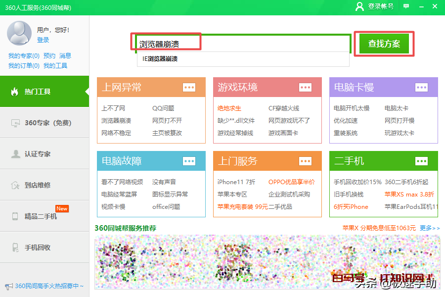 第三步,然后我们在弹出的【360人工服务】的窗口中,输入【浏览器崩溃】,然后点击【查找方案】按钮。