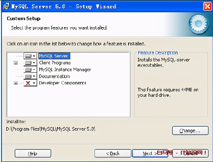 上一步选择了 Custom 安装,这里将设定 MySQL 的组件包和安装路径,设定好之后,单击 Next 继续安装。